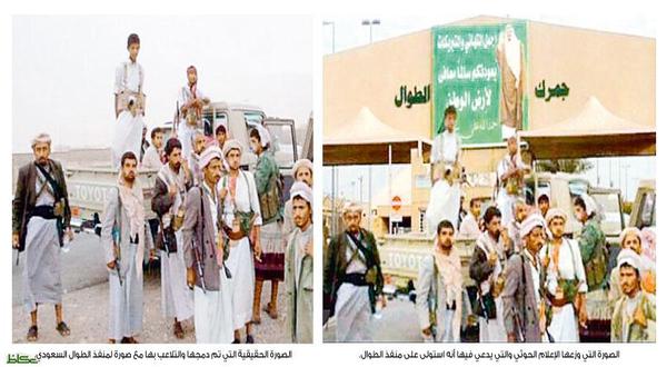 واضافت صحيفة عكاظ السعودية “لم يكتف الإعلام الحوثي القاصر والعاجز بفضيحة الأكاذيب والمغالطات وراح يروج إلى بطولة مزيفة جديدة، حين ادعى أن الحوثيين استولوا على منفذ الطوال الحدودي المطل على منفذ حرض اليمني، واستخدموا صوراً «مفبركة» بطريقة رديئة، بغية رفع الروح المعنوية لأعوانهم وكسب مقاتلين جدد من أطفال زجوا بهم في المعارك، وأميين لا يستطيعون القراءة والكتابة ويمكن خداعهم بسهولة.”