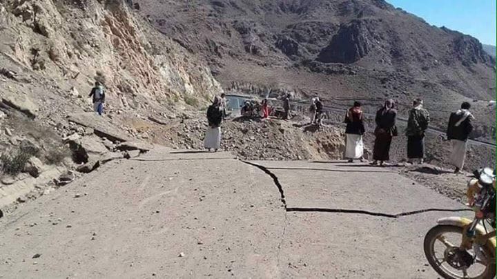 تداول نشطاء على مواقع التواصل الاجتماعي صورة تظهر اثار الدمار والطريق المقطوعة في نقيل يسلح بعد ان قامت طائرات التحالف العربي بقصف المكان .