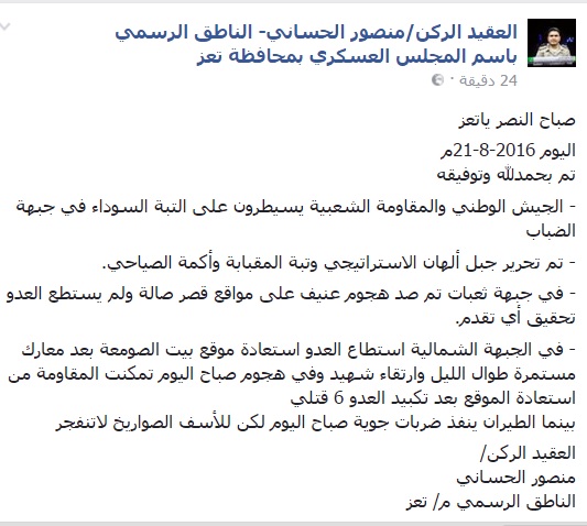 وقال العقيد الركن منصور الحساني الناطق الرسمي للمجس العسكري بتعز ان الجيش الوطني والمقاومة الشعبية يسيطرون على التبة السوداء في جبهة الضباب” فيما تم “تحرير جبل ألهان الاستراتيجي وتبة المقبابة وأكمة الصياحي.”