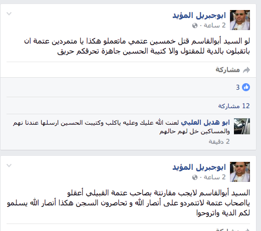 وقال جبريل في منشور على صفحته بموقع التواصل الإجتماعي “فيس بوك” رصده “الرأي برس”: لو السيد أبوالقاسم قتل خمسين عتمي ماتعملو هكذا يا متمردين عتمة ان باتقبلون بالدية للمقتول والا كتيبة الحسين جاهزة تحرقكم حريق.