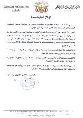 من جانب اخر اكدت القنصلية العامة للجمهورية اليمنية في تحذير سابق لها انها ليست الجهة المعنية بإصدار التصاريح الخاصة بالحج وان هذا من اختصاص وزارة الحج والعمرة في المملكة العربية السعودية.