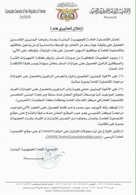 حذرت القنصلية العامة للجمهورية اليمنية بجدة جميع الرعايا اليمنين المقيمين والوافدين والزوار الراغبين الحصول على جوزات السفر من الوقوع في فخ الوسطاء او السماسرة او من يدعون علاقتهم بالقنصلية او بموظفيها على حد تعبير القنصلية.