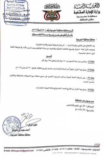 فيما نصت المادتين الثالثة والرابعة منه ” على شركة النفط اليمنية بساحل حضرموت التعميم على جميع محطات بيع المحروقات بالمحافظة والإلتزام بالسعر الجديد والعمل به من التاريخ المحدد وابلاغ كافة الجهات المختصة به” .