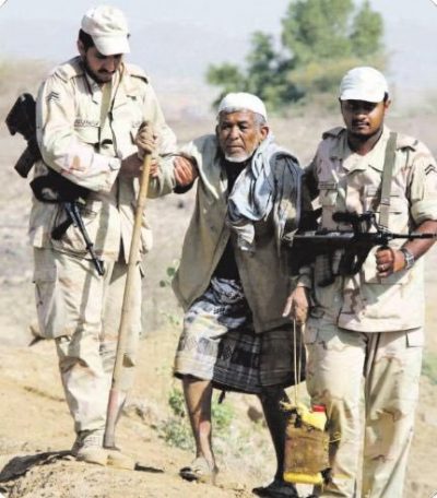شاهد صورة مؤثرة لجنود سعوديين مع مسن يمني على حدود المملكة مع اليمن
