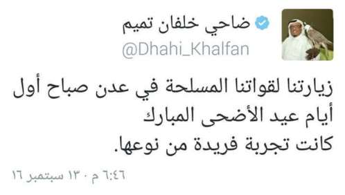 وذكر خلفان في تغريدات على صفحتة الشخصية في موقع التواصل الإجتماعي “تويتر” أنه زار القوات المسلحة الإماراتية في عدن والقوات المرابطة في مدينة”عصب” الأرتيرية صباح أول أيام عيد الأضحى المبارك.