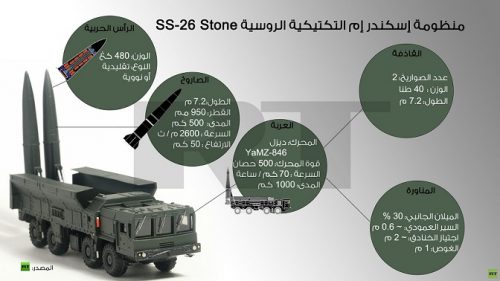 وتجدر الإشارة إلى أنآ منظومة “إسكندر-إم” الصاروخية تستطيع إصابة أهداف صغيرة ومجموعات أهداف متنوعة على مسافات تصل إلى 500 كيلومتر.