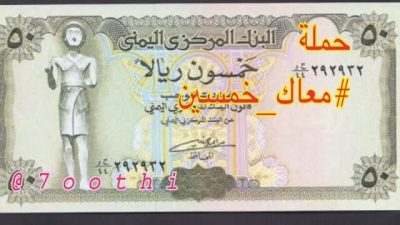 واطلق نشطاء عبر مواقع التواصل الاجتماعي هاشتاق بعنوان #معك_خمسين يسخر من دعوة زعيم الحوثيين الذي دعا فيها يوم أمس خلال كلمه متلفزة بالتضامن مع البنك المركزي وجمع التبرعات له بعد قرار رئيس الجمهورية بنقله إلى عدن وتعيين وزير المالية منصر القعيطي محافظًا للبنك المركزي .