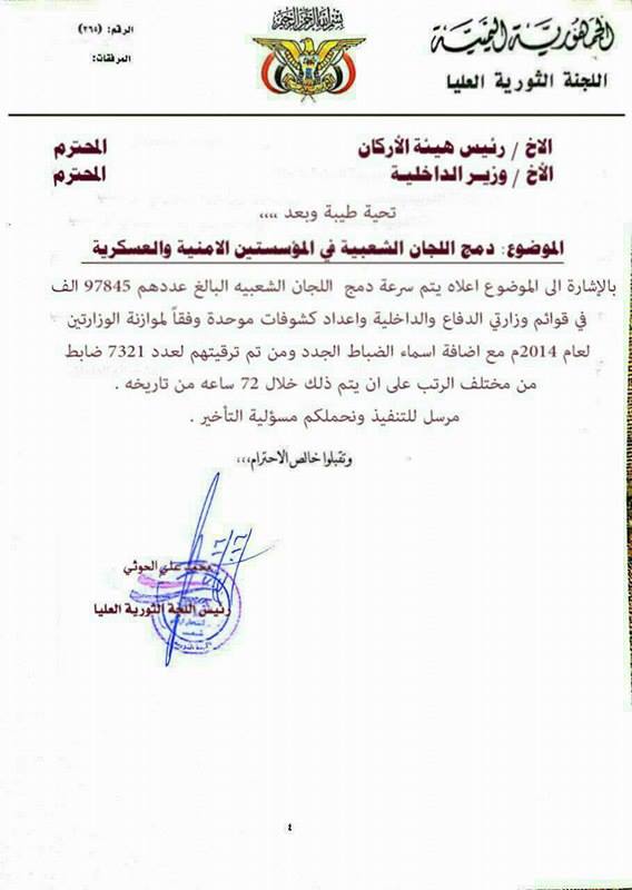 وجه مايسمى برئيس اللجنة الثورية التابعة للحوثيين والتي تسيطر على مؤسسات الدولة في صنعاء رئيس هيئة الأركان العامة بوزارة الدفاع ووزير الداخلية في صنعاء بدمج اللجان الشعبية ضمن المؤسسة الأمنية والعسكرية .