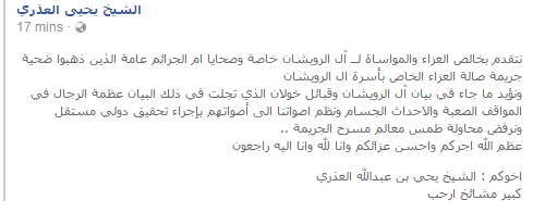 وتقدم الشيخ العذري بخالص تعازيه ومواساته لأسرة الرويشان ولأسر الضحايا فيما وصفه بـ “أم الجرائم”، مشيداً بالبيان الذي كان قد صدر من الأسرة مساء يوم أمس والذي يدعو الى التريث والتحقيق قبل إصدار الاتهامات جزافاً ودون تثبّت.