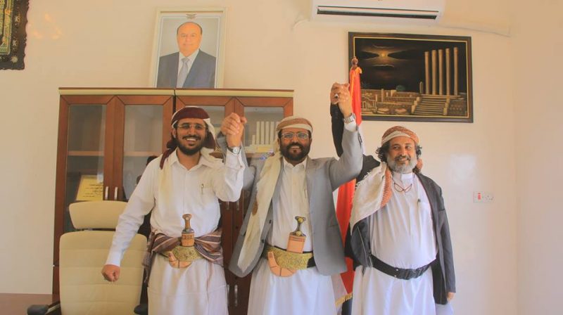 وأعلن العكيمي الذي يقود المقاومة العسكرية والشعبية ضد الحوثيين في الجوف، دعم محافظته لمحافظة البيضاء في معركة تحريرها من الانقلابيين، وأشاد محافظ البيضاء بجهود محافظي مأرب والجوف من أجل توحيد الجهود والتنسيق للعمل ضمن إقليم سبأ.