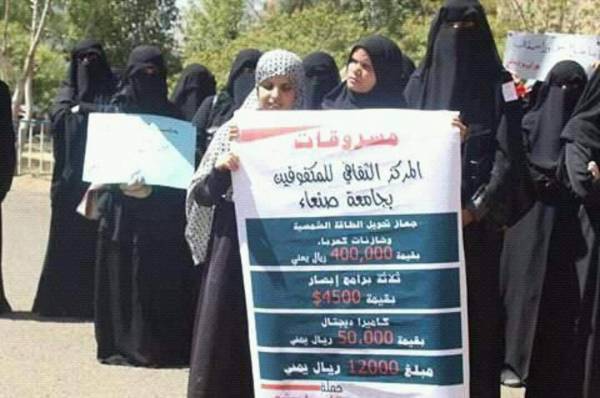 نفذ العشرات من الطلاب والطالبات المكفوفين بجامعة صنعاء وقفة احتجاجية أمام رئاسة الجامعة صباح اليوم الثلاثاء للمطالبة بإعادة مسروقات المركز الثقافي للمكفوفين بالجامعة ومحاسبة الجناة.
