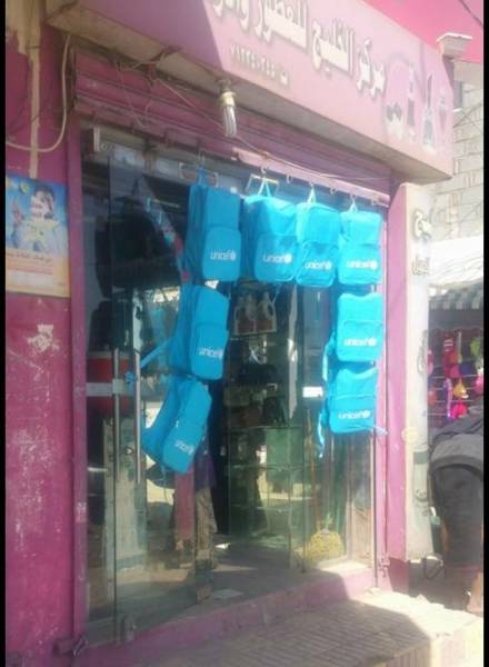 وقال الناشطون عقب تداولهم الصورة ” حقائب اليونسيف تباع في الأسواق في اشارة منهم ان الحقائب تعرضين لصفقة من بعض النافذين وبيعها بالأسواق.