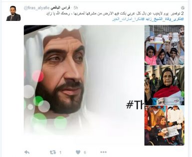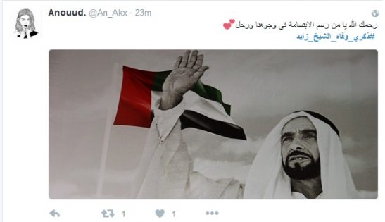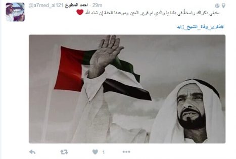 وقال المغرد فراس اليافعي في ذكرى وفاة زايد: “2 نوفمبر يوم لايغيب عن بال كل عربي بكت فيھا الارض من مشرقھا لمغربھا، رحمك الله يا زايد”.