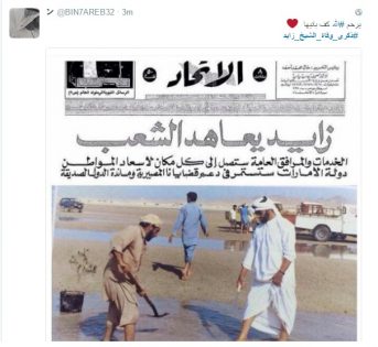 ونشر مغرد صورة قديمة لغلاف في صحيفة الاتحاد المحلية، يظهر فيها الشيخ زايد وهو يقوم بالمساهمة في إنشاء الخدمات والمرافق العامة، حيث تعهد زايد بإيصال الخدمات والمرافق العامة إلى كل مكان لإسعاد المواطن الإماراتي.