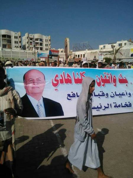 ورفع المشاركون في التظاهرة اللافتات المعبرة عن مطالبهم كما رفعوا صور رئيس الجمهورية وصور قيادات عاصفة الحزم .