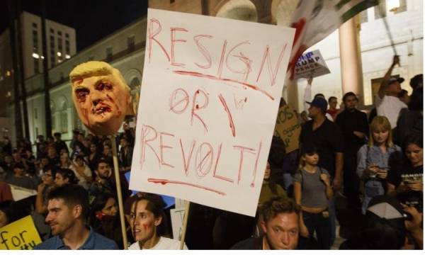 وفي نيويورك نزل آلاف المحتجين إلى شوارع وسط مانهاتن، وشقوا طريقهم إلى برج ترامب حيث يعيش الرئيس المنتخب في الشارع الخامس. وتجمع مئات آخرون في متنزه بمانهاتن وهتفوا “ليس رئيسي”.