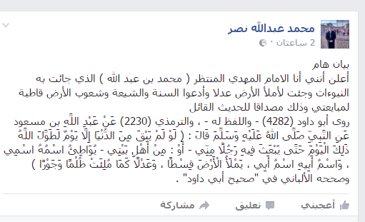 وقال الشيخ محمد عبدالله نصر، عبر صفحته الشخصية على موقع التواصل الإجتماعى “فيس بوك”: ” أنني أنا الامام المهدي المنتظر ( محمد بن عبد الله ) الذي جائت به النبوءات وجئت لأملأ الأرض عدلا وأدعوا السنة والشيعة وشعوب الأرض قاطبة لمبايعتي وذلك مصداقا للحديث القائل” .