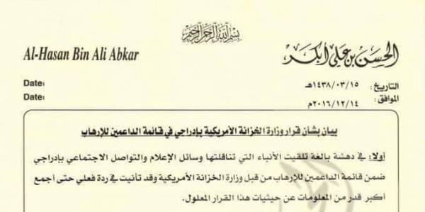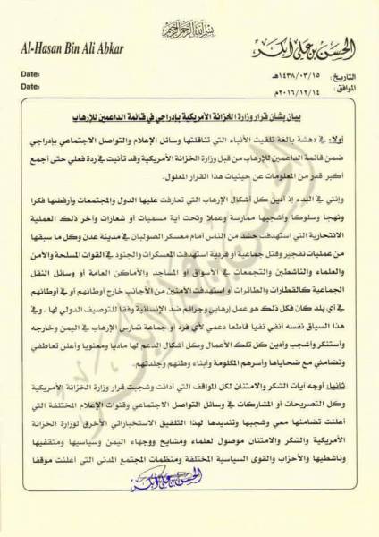 ادان الشيخ الحسن أبكر القيادي في حزب التجمع اليمني للإصلاح اليوم الأربعاء قرار وزارة الخزانة الأمريكية الذي اتهمه وشخص اخر ما وصفه بدعم بالإرهاب في جزيرة العرب.