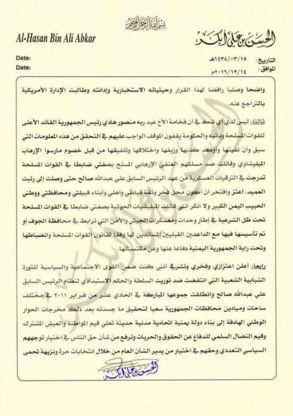 الجدير بالذكر ان الخزانة الأمريكية كانت قد فرضت الاربعاء الماضي عقوبات على يمنيين اثنين من بينهما الشيخ الحسن ابكر بمزاعم أنهما “على صلة بتنظيم القاعدة في جزيرة العرب، وهو ما لاقى رفضا شعبيا وسياسيا كبيرا في اليمن.