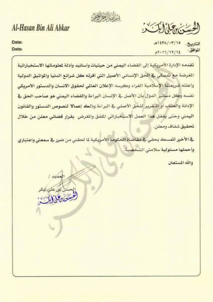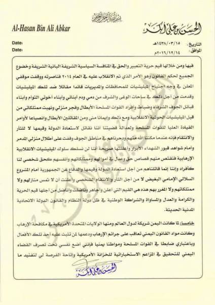 وقال الشيخ “إني أضع نفسي تحت تصرف القضاء اليمني للتحقيق في المزاعم الاستخباراتية للخزانة الأمريكية واتاحة الفرصة لي لتفنيد ما تقمه الادارة الامريكية الى القضاء اليمني من حيثيات وادلة”.