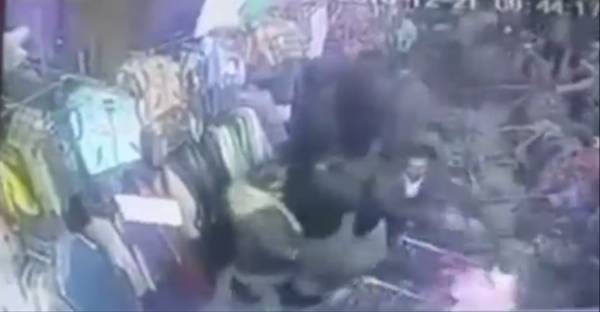 ويظهر في الفيديو، الذي التقطته كاميرا مراقبة مثبة في المتجر، عناصر المتمردين وهم يرمون الملابس على الأرض وينهرون العاملين به.