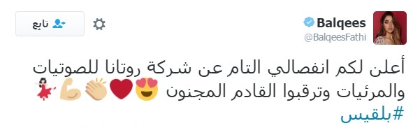 وجاء خبر الانفصال في تغريدة لبلقيس عبر حسابها الرسمي في تويتر: “أعلن لكم انفصالي التام عن شركة روتانا للصوتيات والمرئيات وترقبوا القادم المجنون”.