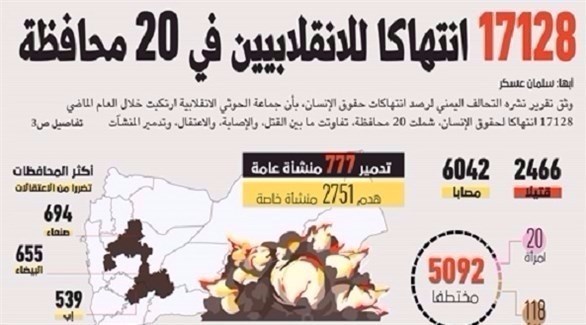 وبحسب صحيفة “الوطن” السعودية، اليوم الجمعة، أوضح بيان صادر عن التحالف، أن عدد القتلى بلغ 2466 قتيلاً، و 6042 جريحاً، فضلاً عن اختطاف واعتقال 5092 مدنياً، فيما تم تدمير 777 من الممتلكات العامة و2751 من الممتلكات الخاصة.