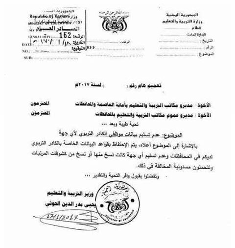 وكان وزير التربية والعليم يحي الحوثي المعين من قبل مليشيا الانقلاب الحوثية قد وجه تعميم –حصل تهامة برس على نسخة منه- لجميع مكاتب التربية والتعليم والوحدات الادارية التابعة لها في المحافظات الخاضعة لسيطرة المليشيا بالاحتفاظ بقاعدة بيانات الكادر التربوي وعدم تسليم أي نسخة منها لأي جهة او تسليم نسخة من كشوفات المرتبات محملا تلك الجهات المسؤولية في حالة المخالفة.
