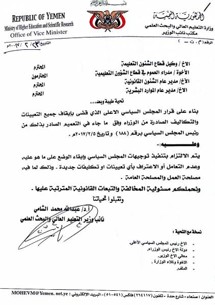 ونصت مذكرة رسمية صادرة عن نائب وزير التعليم العالي والبحث العلمي القيادي الحوثي المدعو عبدالله الشامي وجهها الي وكلاء ومدراء عموم الوزارة مؤرخة (٢٣ فبراير ٢٠١٧م) – حصلنا على نسخة منها: “بناء على قرار المجلس السياسي الاعلى الذي قضى بايقاف جميع التعيينات والتكاليف الصادرة من الوزراء وفقا ماجاء في التعميم الصادر بذلك من رئيس المجلس السياسي رقم (١٨٨) (٥ فبراير ٢٠١٧م) .. وعلية يتم الالتزام بتنفيذ توجيهات المجلس السياسي وايقاف الوضع على ماهو عليه وعدم التعامل او الاعتراف باي تعيينات او تكاليف جديدة وذلك لما فيه مصلحة العمل والمصلحة العامة”.