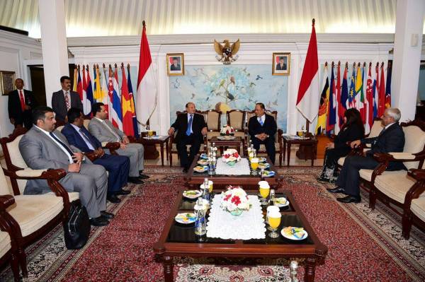 وقد اصطحب الرئيس الى صالة كبار الضيوف ورحب بهذه الزيارة والمشاركة في أعمال القمة التي سيلتقي خلالها بالرئيس الاندونيسي وعددا من قادة الدول المشاركة في القمة.