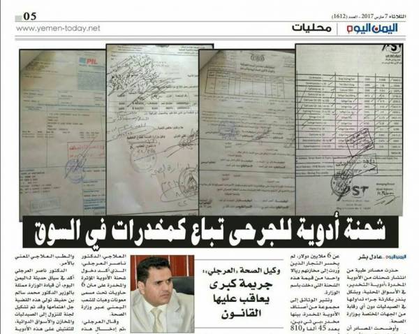 وقالت المصادر ” أن تلك الأدوية دخلت مناطق الحوثيين كمساعدات طبية بدون أي جمارك أو مرورها على مصلحة الضرائب ،، وأكدت الصحيفة ” أنها حصلت على 6 ثائق تثبت دخول 6 حاويات قدماً تحمل 24 صنفاً من الأدوية البشرية ومن ضمنها أدوية مخدرة ومؤثرات عقلية تصل قيمتها إلى 2مليون و400ألف دولار ولاتقل قيمة بيعها عن 6 ملايين دولار أي بما يعادل الريال اليمني قرابة إثنين مليار ريال .