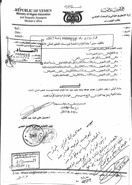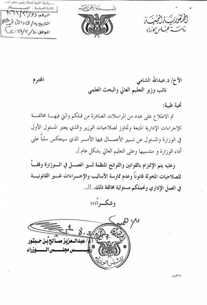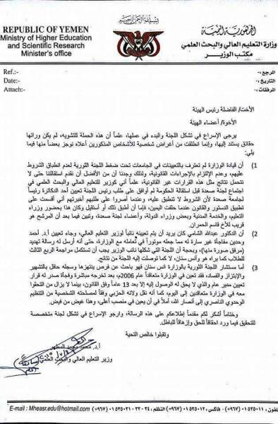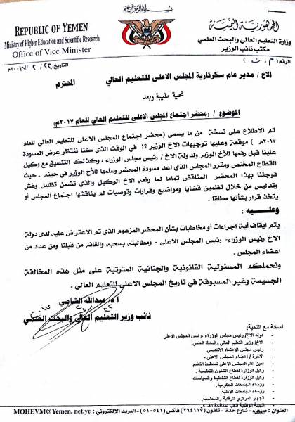 شرارة الحرب هذه المرة انطلقت من وزارة التعليم العالي والبحث العلمي .. وذلك على خلفية القرار الصادر امس الاول عن حكومة الانقلاب التي يرأسها بن حبتور، والذي قضى بمحاسبة نائب وزير التعليم العالي المدعو عبدالله الشامي واعوانه واحالتهم الى نيابة الاموال العامة لتورطهم بارتكاب قضية فساد خطيرة تعد اكبر عملية فساد منظم وممنهج تشهدها الوزارة .. والذي على اثره وجهت نيابة الاموال العامة استدعاءات رسمية للمذكورين طالبة مثولهم امامها للتحقيق.