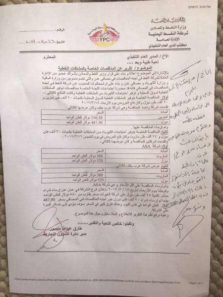 وتظهر المذكرة المرفوعة من طرق منصور مدير دائرة الشئون التجارية، وممثل الشركة في لجنة المناقصات المخصصة لدراسة عروض الشركات لشراء كميات من النفط للسوق المحلية، وكميات أخرى احتياجات شركات الكهرباء.