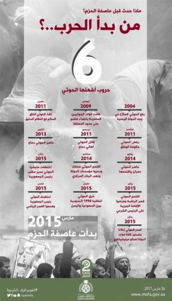 نشرت وزارة الخارجية إنفوجرافيك يوضح جميع الحروب التي أشعلها التمرد الحوثي في اليمن منذ عام 2004 وحتى مارس 2015، تاريخ بداية “عاصفة الحزم” لإعادة الشرعية في اليمن