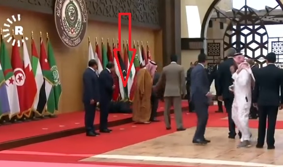 وتوجه ميشال عون لإلتقاط صورة تذكارية مع الزعماء العرب ولكنه سقط على الارض كما يظهر في الفيديو بشكل قوي ومؤلم.