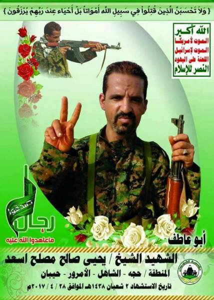 قتل الشيخ القبلي البارز يحيى صالح مصلح أسعد أحد وجهاء مديرية الشاهل بمحافظة حجة و أبرز قيادات مليشيا الحوثي والمخلوع في جبهة ميدي شمال غرب البلاد.