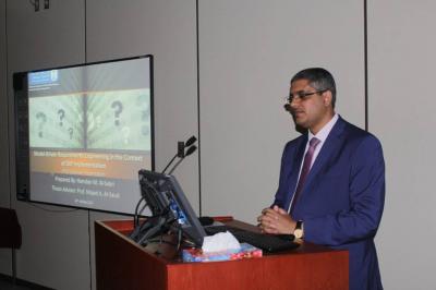 خلال المناقشة عرض الباحث تفاصيل المادة العلمية والمسيرة البحثية لمرحلة الدكتوراه، والتي ركزت على تحديد الفجوة الكبيرة القائمة بين نظم تخطيط موارد المؤسسات والمنظمات الراغبة بالتكيف على تلك النظم من خلال تطبيق افضل الممارسات، وسد تلك الفجوات عن طريق تحديد مناطق التغيير داخل المنظمات الخاصة أو الحكومية، وذلك بأسهل وأفضل وأرخص الطرق الممكنة، عن طريق إستخدام تقنية تشابهه أو تطابق النموذج كتقنية جديدة لهندسة متطلبات تطبيق البرمجيات الجاهزة.