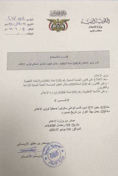 أصدر وزير الإعلام معمر الإرياني قرارا بتعيين الصحافي المقرب من المخلوع صالح، أمين الوائلي سكرتيرا صحفيا لوزير الإعلام.