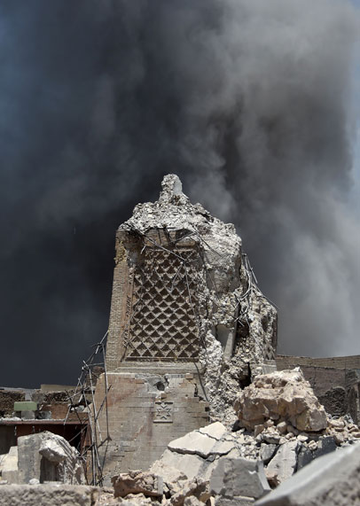 وأكدت زيارة قامت بها رويترز للموقع يوم الجمعة، وذلك بعد يوم واحد من استعادة الجيش العراقي المكان، حجم الدمار الذي لحق به حيث أصبحت المنارة الحدباء التي يبلغ ارتفاعها 45 مترا مثل شجرة مقطوعة الجذع في حين لم يتبق من المسجد سوى قبته الخضراء.