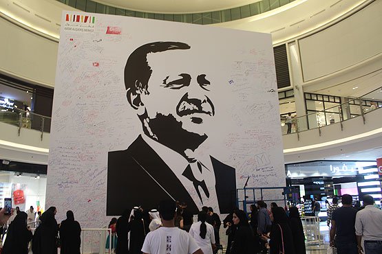 اختار قطريون في أحد المراكز التجارية بالعاصمة الدوحة، التعبير عن تقديرهم وشكرهم للرئيس التركي رجب طيب أردوغان، بإقامة جدارية عملاقة حملت صورته.