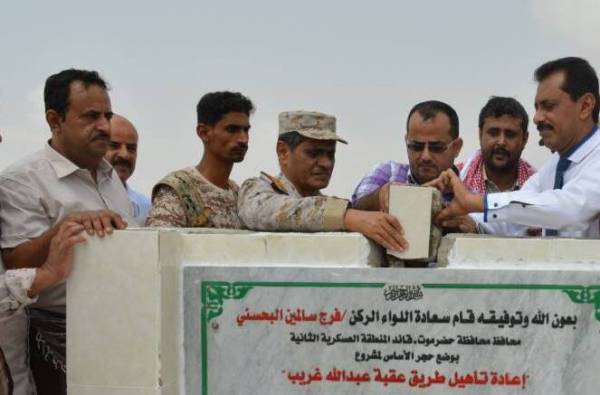 وضع محافظ حضرموت قائد المنطقة العسكرية الثانية اللواء “فرج سالمين البحسني” اليوم حجر الأساس لمشروع إعادة تأهيل طريق عقبة عبدالله غريب بكلفة تقدر بـ 483 مليون ريال بتمويل مشترك حكومي بنسبة 75% و 25 % منحة ومساهمة مجتمعية من الشركة العربية اليمنية للاسمنت المحدودة.