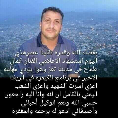 تداول بعض رواد منصات التواصل أنباء تفيد بمقتل الفنان الكوميدي كمال طماح إثر غارة للتحالف العربي وذلك أثناء تواجده في محافظة تعز وسط اليمن.