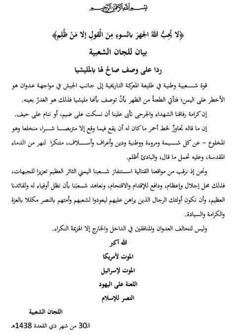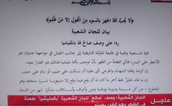 وذكر البيان ، الذي تداولته وسائل اعلام حوثية خصوصاً القناة الرسمية التابعة للمليشيات قناة المسيرة ، مساء الثلاثاء، إن وصف صالح لـ«اللجان الشعبية بالميليشيات، هو طعنة من الظهر، وهو الغدر بعينه، وإن كرامة رفاقنا الشهداء والجرحى تأبى علينا أن نسكت على ضيم، أو ننام على حيف».