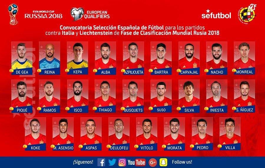 اعلن مدرب منتخب اسبانيا جولين لوبيتيجي عن قائمة المنتخب المشاركة في تصفيات كأس العالم 2018 , وشهدت القائمة تواجد لاعب برشلونة السابق دافيد فيا بعد التألق في الفترة الاخيرة .
