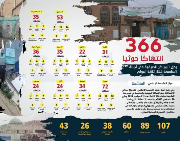 وفي رصد أعده “مركز العاصمة الاعلامي” فقد بلغ إجمالي الانتهاكات بحق المراكز الصيفية في مديريات العاصمة صنعاء 366 انتهاك منذ 21 سبتمبر 2014 وحتى 20 اغسطس 2017م.