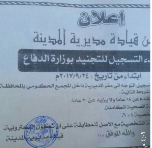 كشفت وثيقة رسمية حصل عليها مركز المحويت الإعلامي عن قيام مدير عام مديرية مدينة المحويت المعين من قبل مليشيا الحوثي بحملة تجنيد في مديرية المدينة وبينت الوثيقة عن قيام السلطة الانقلابية في مدينة المحويت بدعوة تسجيل مجندين من أبناء المديرية لتزج بهم في معركتها الخاسرة.