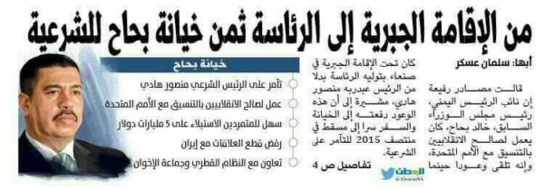 وحسب المعلومات التي حصلت عليها الصحيفة من مصادر رفيعة حسب قولها، فإن نائب رئيس الجمهورية رئيس مجلس الوزراء السابق، خالد بحاح، كان يعمل لصالح الحوثيين بالتنسيق مع الأمم المتحدة، وأنه تلقى وعودا حينما كان تحت الإقامة الجبرية في صنعاء بتوليه الرئاسة بدلا من الرئيس الشرعي عبدربه منصور هادي، وتم التنسيق معه عبر شخص تابع للحوثيين يدعى يحيى العماد القائم بالأعمال بالسفارة اليمنية في كندا.