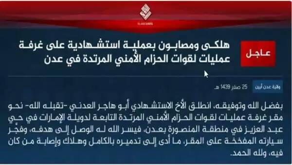 وقال التنظيم أن عنصره الإرهابي ويدعى أبو هاجر العدني فجر نفسه في غرفة عمليات الحزام الأمني في حي عبدالعزيز في المنصورة بعدن ، ما أدى إلى تدميره بالكامل .
