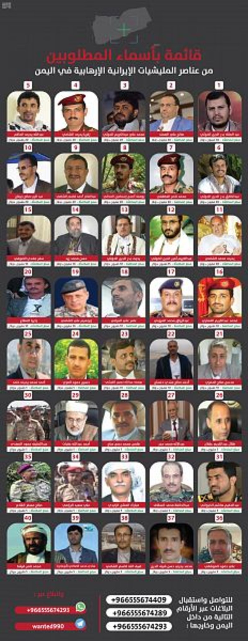 عرضت المملكة العربية سعودية مجموعة أرقام خاصة للتواصل والابلاغ عن أي شخص مطلوب من قائمة الـ 40 قيادي في جماعة الحوثي الانقلابية، والتي اعلنت عنهم في وقت سابق.