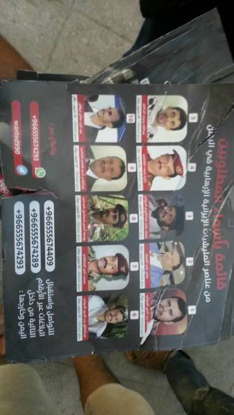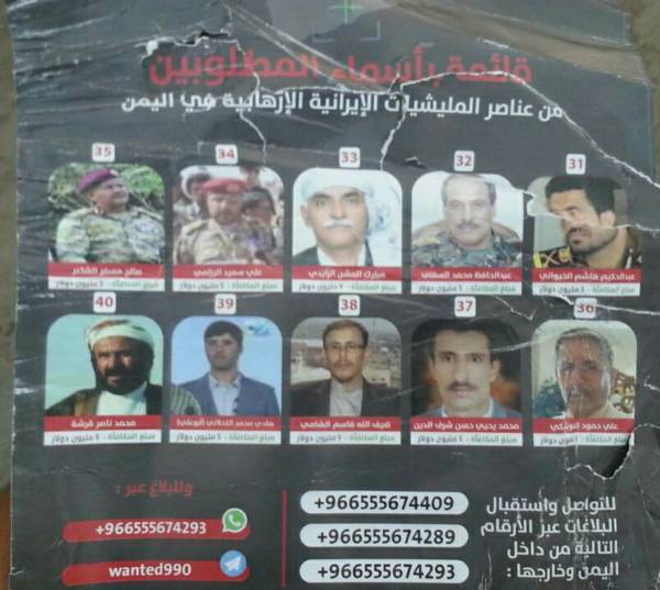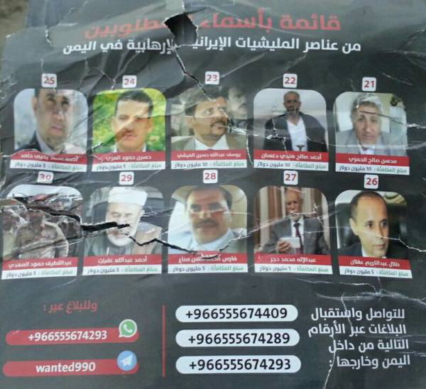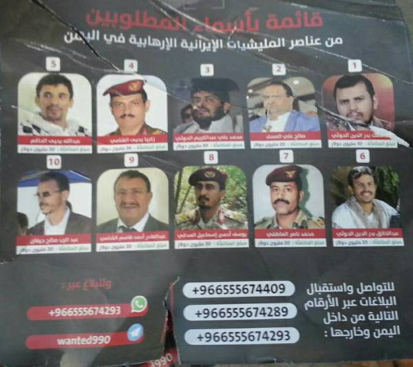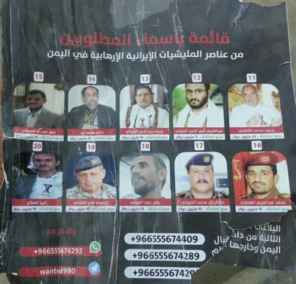 وتحتوي المنشورات على قوائم بأسماء وصور قيادات الميليشيات الحوثية الارهابية بالاضافة الى مبالغ المكافأ وارقام التواصل للإبلاغ.